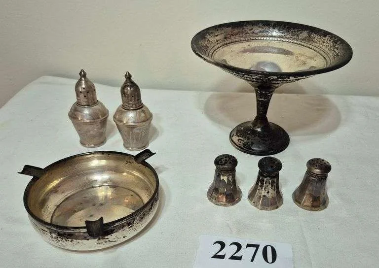 2270 Sterling silver ashtray, three individual shakers, weighted Sterling compote, pair of weighted Sterling shakers