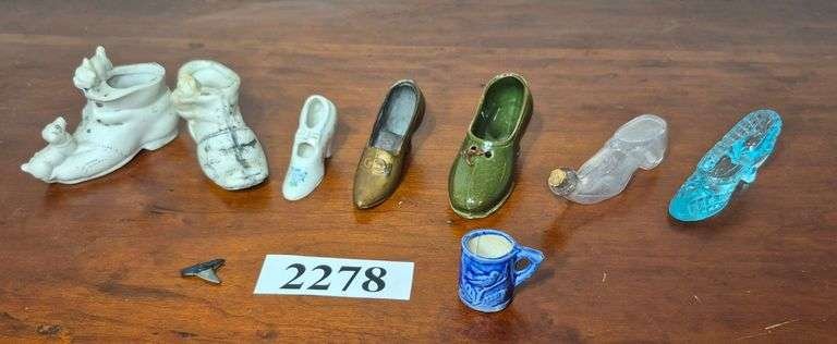 2278 Ceramic, glass, and metal miniature shoe figurines, miniature mug, tooth