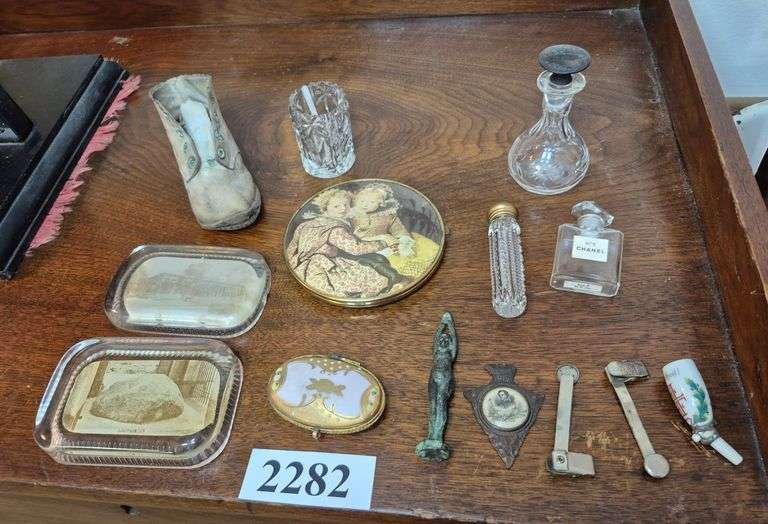 2282 Ceramic trinket box, perfume bottles, souvenir paper weights, antique porcelain pipe stem, toothpick holder, baby shoe, Etc