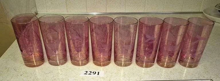 2291 Set of eight pheasant etched purple drinking glasses