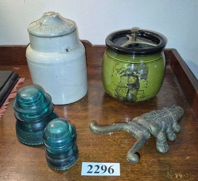 2296 Crock, two glass insulators, tobacco humidor, reproduction boot jack