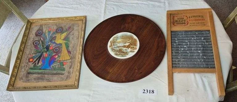 2318 Currier and Ives lazy susan, lingerie washboard, framed wall hanging