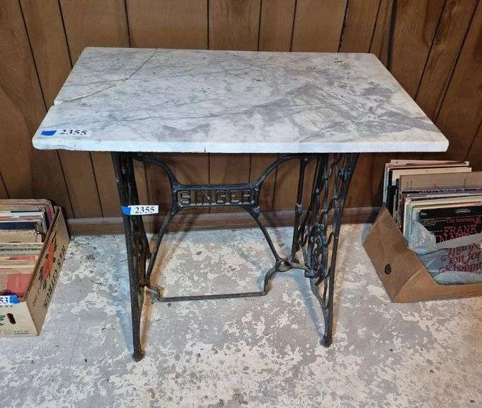 2355 Marble top table made from antique Singer treadle sewing machine base