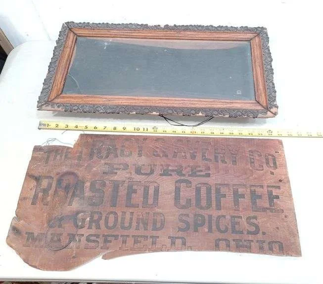 6028 Antique shadow box frame, piece of antique coffee crate.
