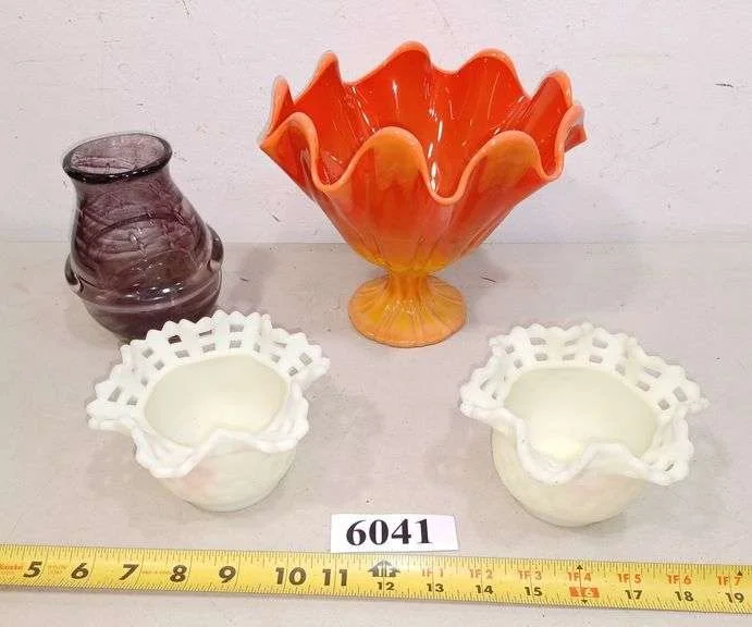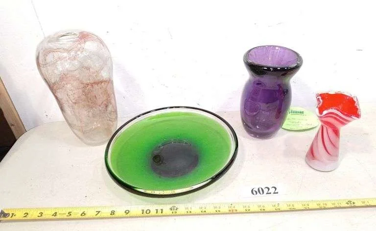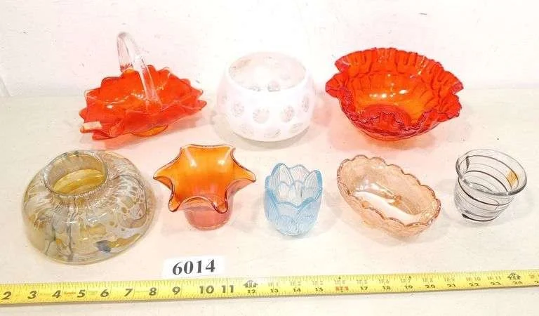 6014 Colored and art glass bowls, basket, vases, Etc