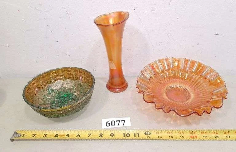 6077 Two Carnival Glass bowls, carnival glass vase