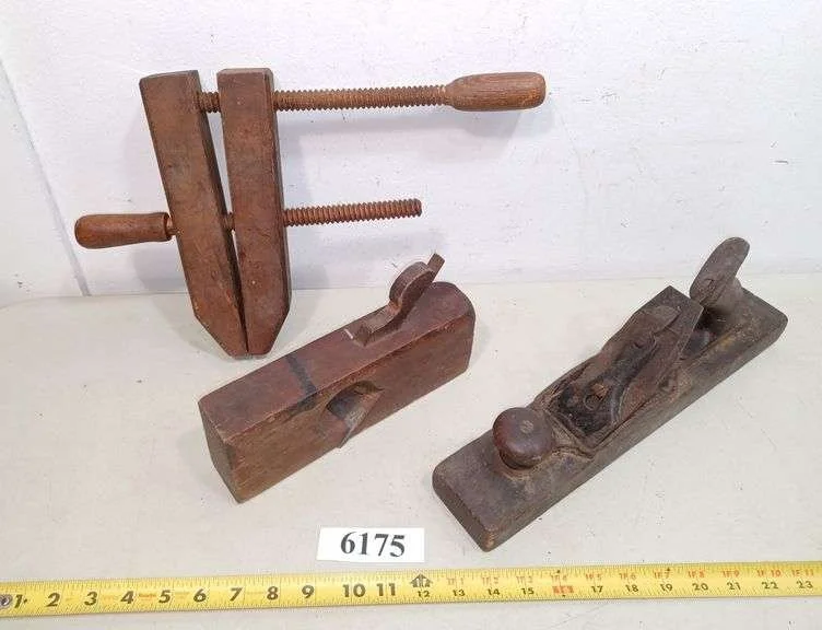 6175 Two antique wood block planes, wood clamp