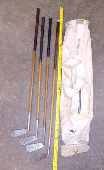 6085 4 antique wood shaft golf clubs, Wilson canvas golf bag