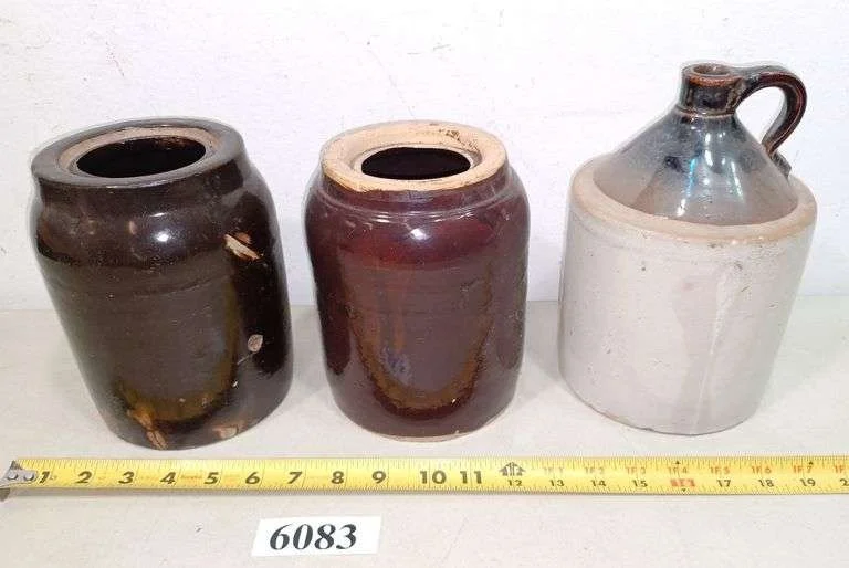 6083 Crock jug, two crock canning jars