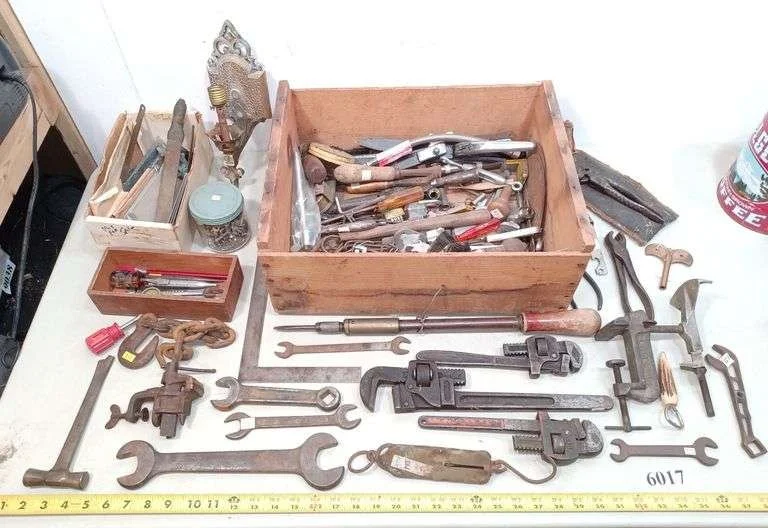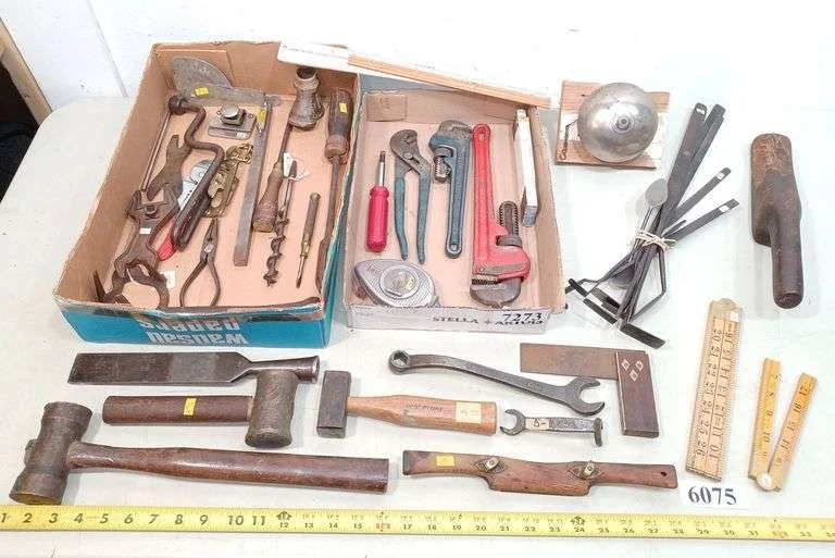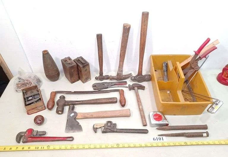 6075 Vintage tools incl. hammers, two Ford wrenches, draw knife, square, rulers, Etc