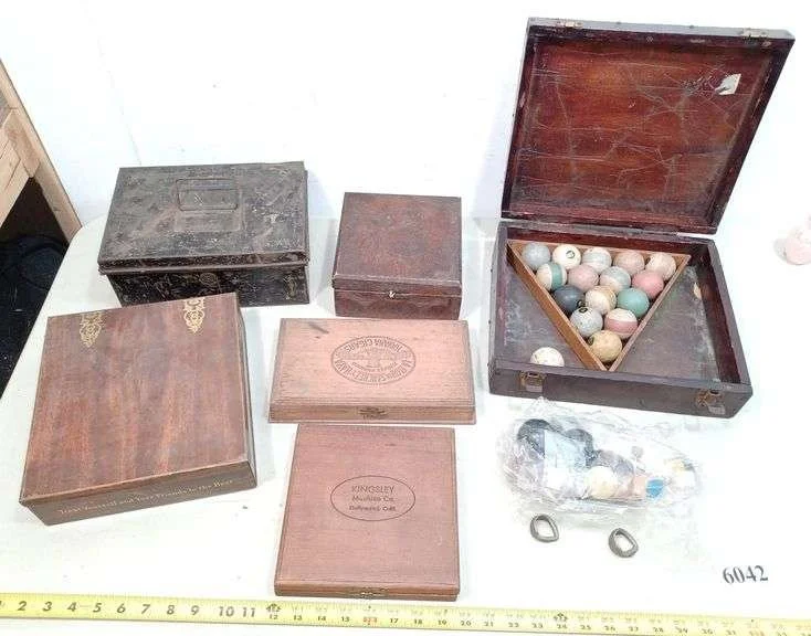 6042 Wood and metal cigar and other boxes, small Billiards set in wood box