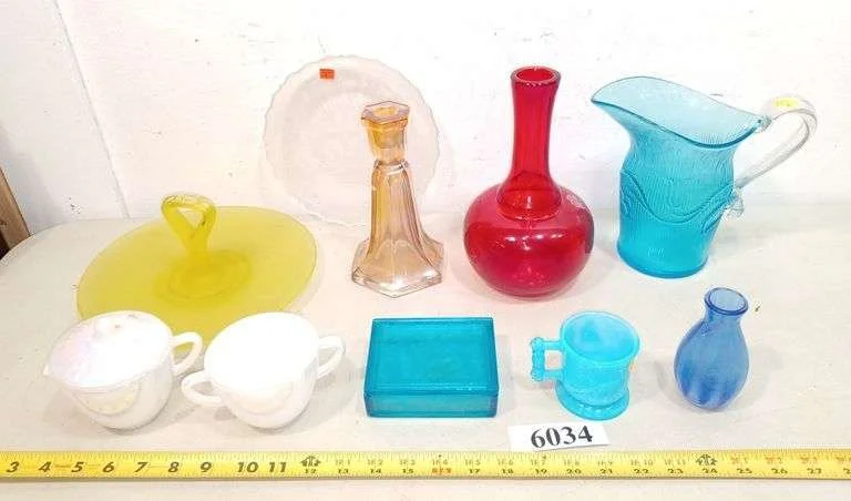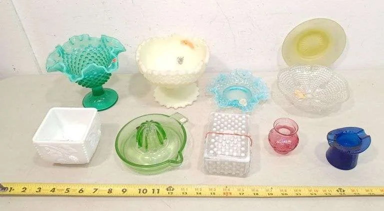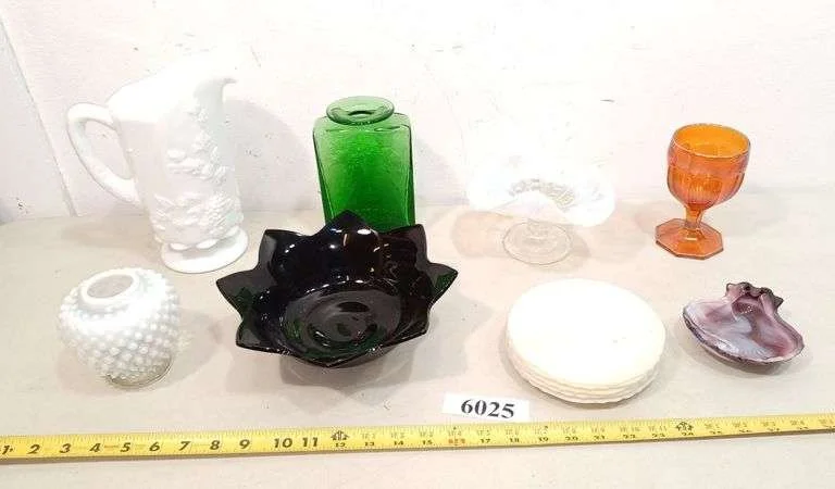 6025 Milk glass pitcher, opalescent compote, hobnail vase, slag glass ashtray, other colored glass items