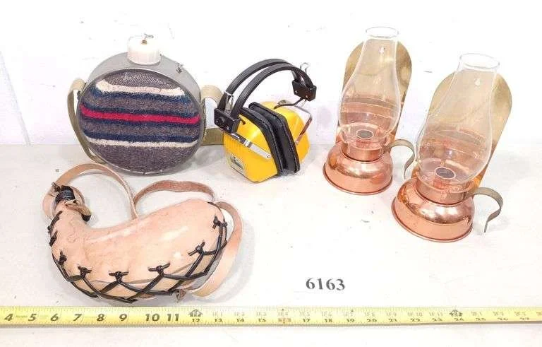 6163 Pair of copper candle lamps, canteen, leather flask, headphone radio
