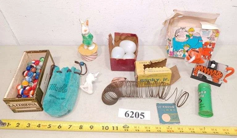 6205 Marbles, miniature Slinky in box, milk glass eggs, bunnies, Etc