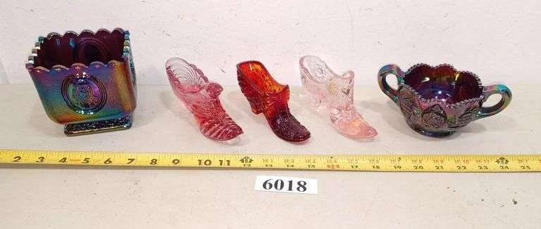 6018 Fenton carnival glass square planter, three Fenton Glass shoes, Carnival Glass sugar