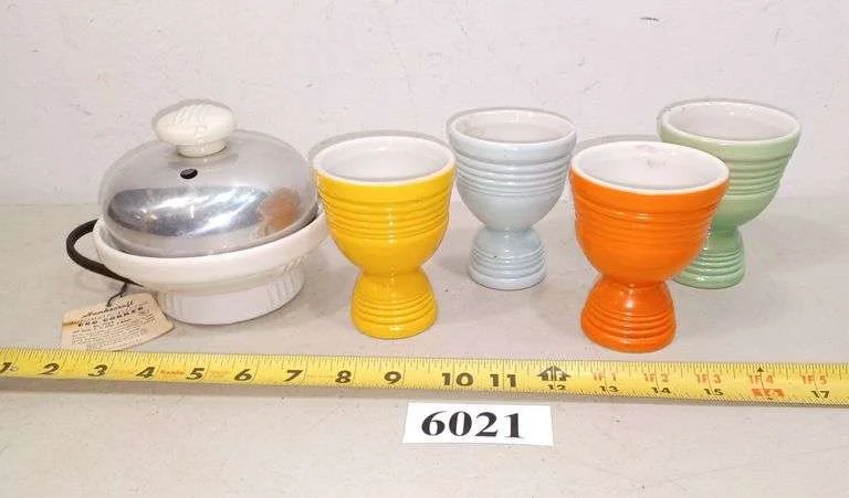 6021 Vintage egg cooker and four egg cups