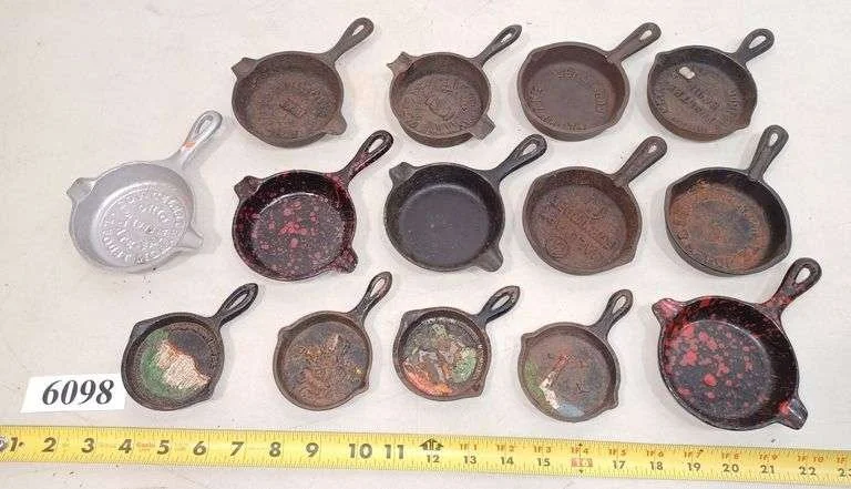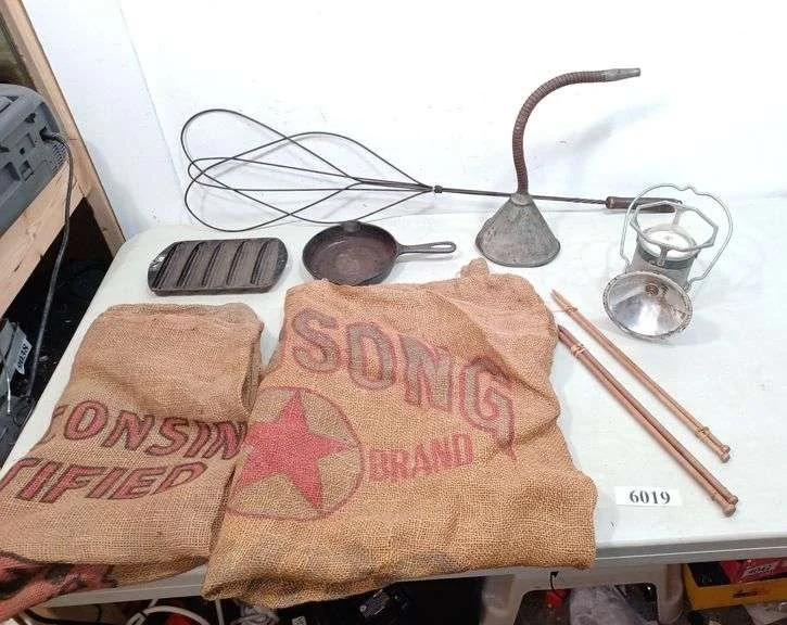 6019 Griswold skillet, corn stick pan, Dietz battery lantern, burlap sacks, rug beater, Etc
