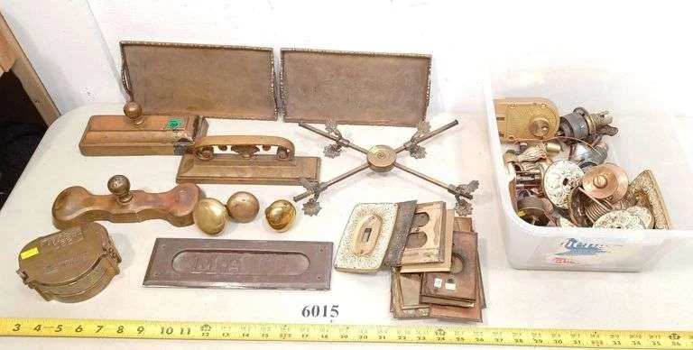 6015 Brass trays, hardware, door knobs, mail slot, switch plates, Etc