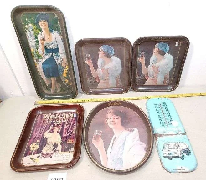 6002 Coca-Cola and Welch's advertising trays, advertising thermometer