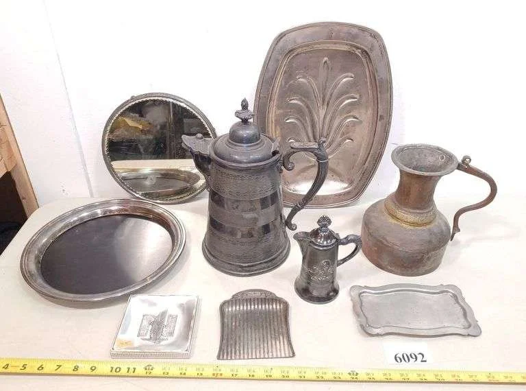 6092 Silver plate coffee pot and creamer, trays, plateau mirror, brass pitcher, Etc