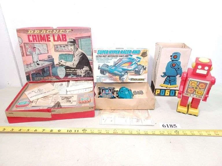 6185 Dragnet crime lab kit, robot in box, Super Hyper racer 4WD in box