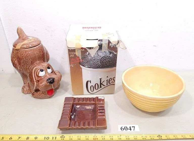 6047 McCoy dog cookie jar, cookie jar in box, McCoy ash tray, yellow mixing bowl
