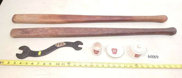 6089 Pennsylvania Railroad wrench, creamer sugar and small plate, two railroad switch levers