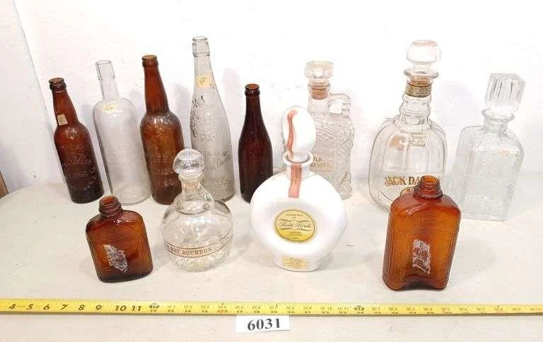 6031 Liquor bottles, Crystal liquor decanter (chip on lip), antique beer bottles, Etc