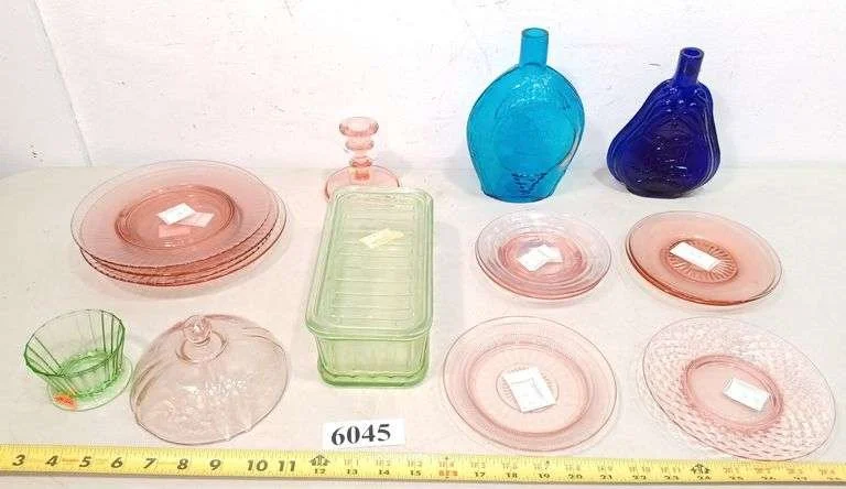 6045 Depression glass, collectible bottles