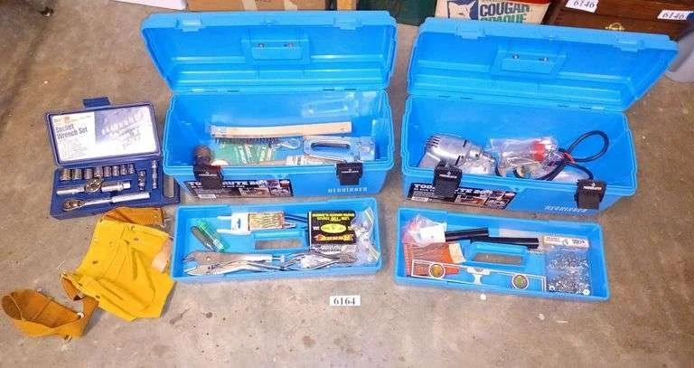 6164 Two blue tool boxes, various hand tools, electric drill, Etc