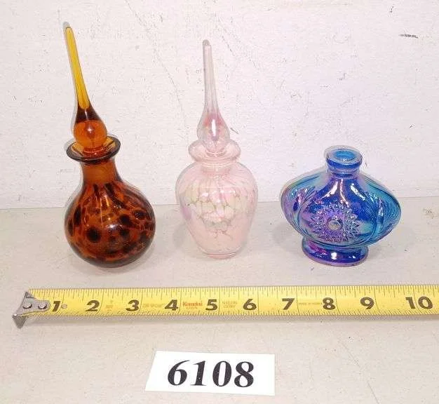 6108 Two perfume bottles with stoppers, carnival glass perfume bottle with no stopper