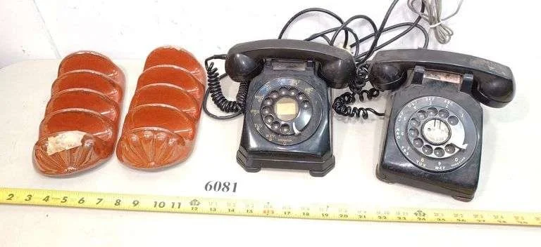 6081 Two rotary dial telephones, two Pottery taco holders