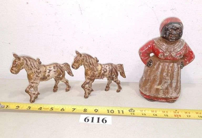6116 Cast iron coin bank, two metal horses
