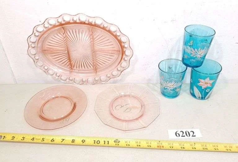 6202 Pink depression plates, three enamel decorated blue tumblers
