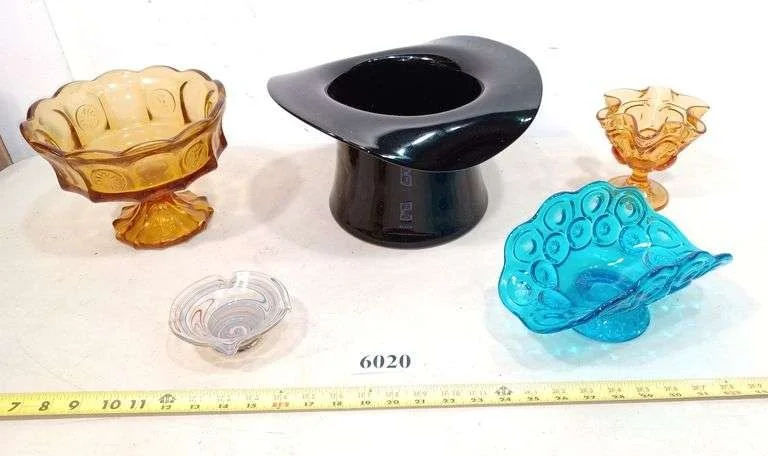 6020 Large black glass top hat, coin spot yellow compote, other colored glass items