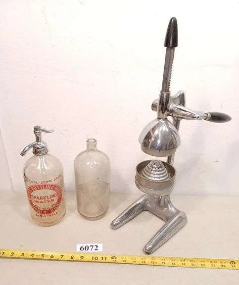 6072 Vintage chrome juicer, two antique Seltzer bottles