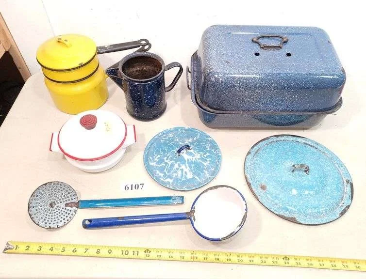 6107 Graniteware roaster, pans, coffee pot, ladles, strainer, Etc
