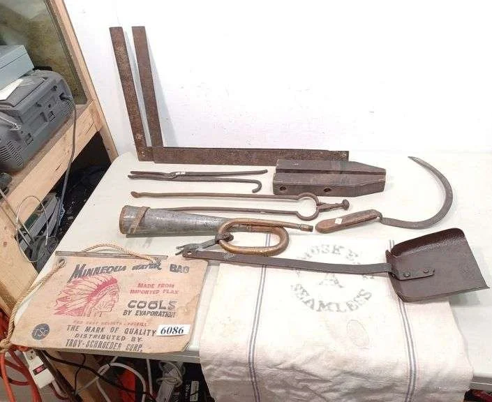 6086 Water bag, sack, primitive tools, horn, Etc