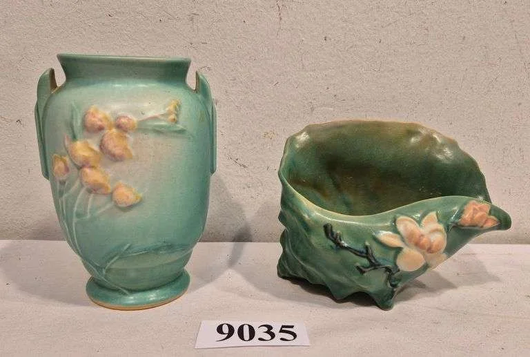 9035 Roseville Pottery Ixia vase, Magnolia conch shell vase/ planter