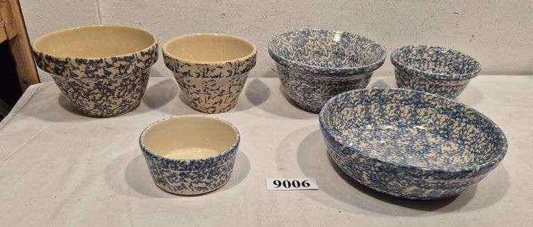 9006 RRP Co and Roseville, Ohio Blue sponge decorated stoneware bowls