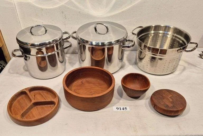 9054 Artist signed for Tiffany & Co. art glass vase, stoneware mixing bowl, blue decorated ceramic vase, nambé stainless bowl, stainless Bowl