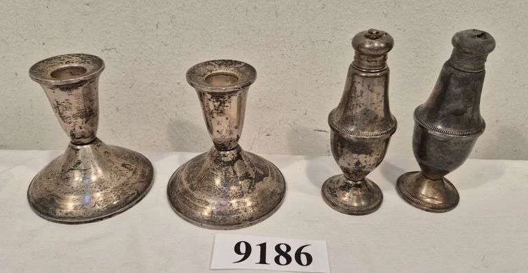 9186 Pair of Sterling weighted candle holders, pair of Sterling weighted shakers