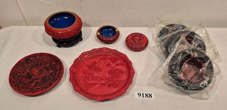 9188 Red resin Asian plates, bowl with wood pedestal, covered dish, ashtray, three new in bag Tire advertising ashtrays