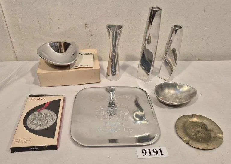 9191 Nambe metal candle holders, vase, nut dish, Christmas ornament, golf trophy plate, two ashtrays