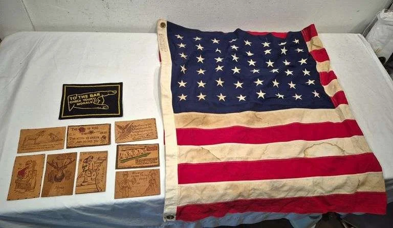 9193 Leather postcards, felt sign, 3 ft by 5 ft 48 star American flag
