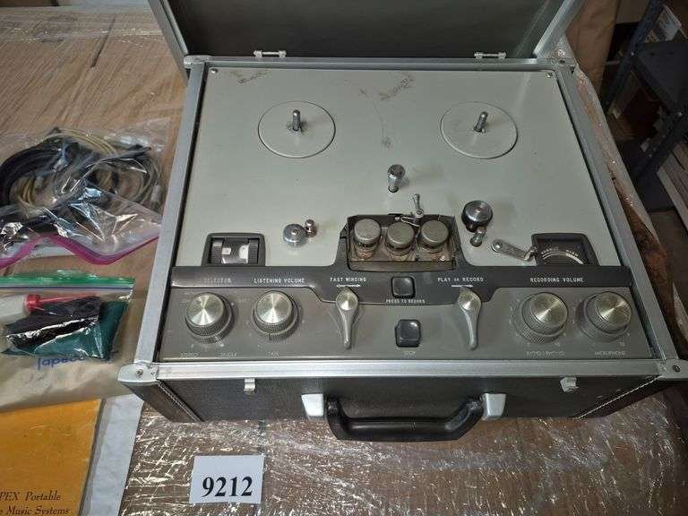 9212 Ampex portable reel to reel tape player with cords, accessories, and manual