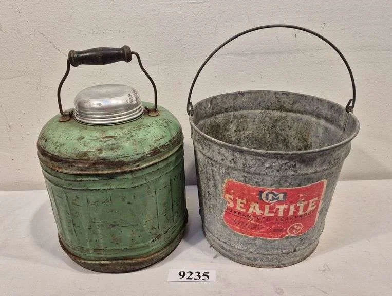 9235 Vintage green metal thermos with wood handle, galvanized bucket
