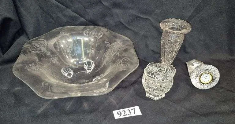 9237 Heisey etched glass footed bowl, Crystal clock, pattern glass vase, Etc