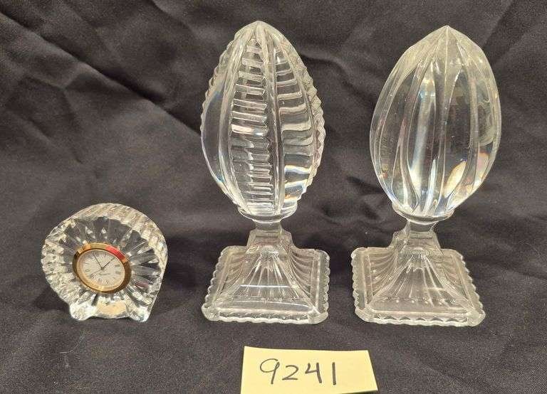 9241 Small crystal clock, two crystal egg ? sculptures