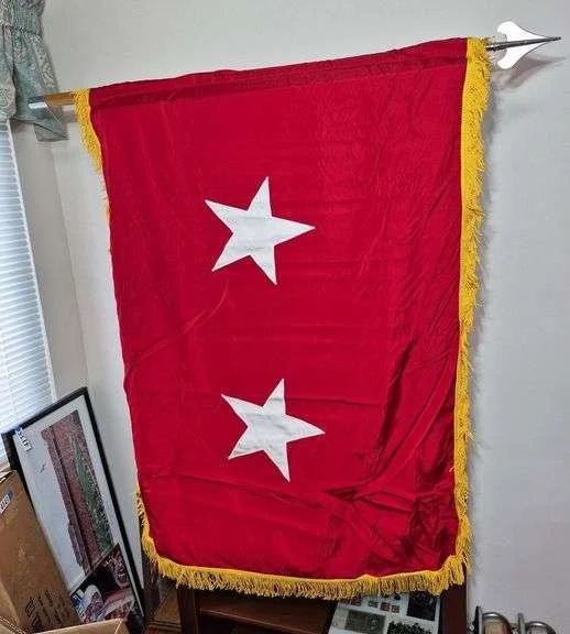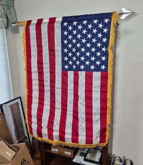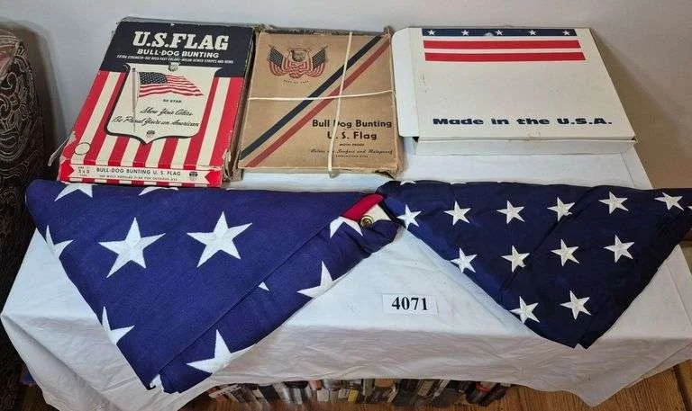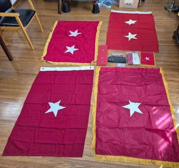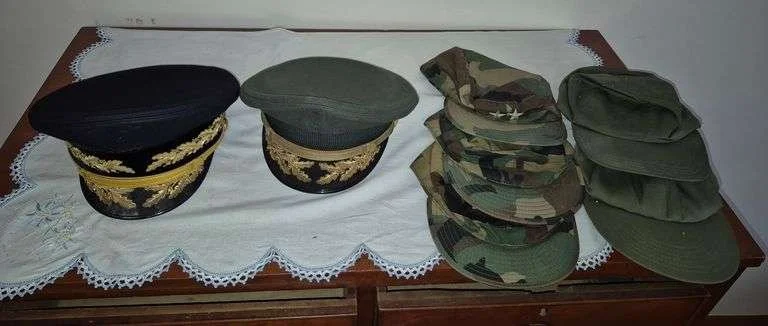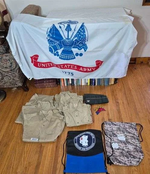 4041 Military items including Army flag, uniform shirts and hats, patches, string bags